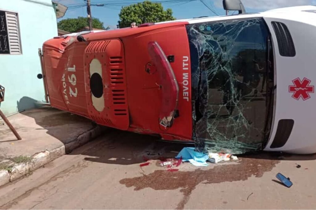 A ambulância estava com a sirene ligada e avançou a placa de “pare” e assim, colidiu com o outro veículo, depois bateu na calçada, provavelmente no poste e logo em seguida acabou capotando.