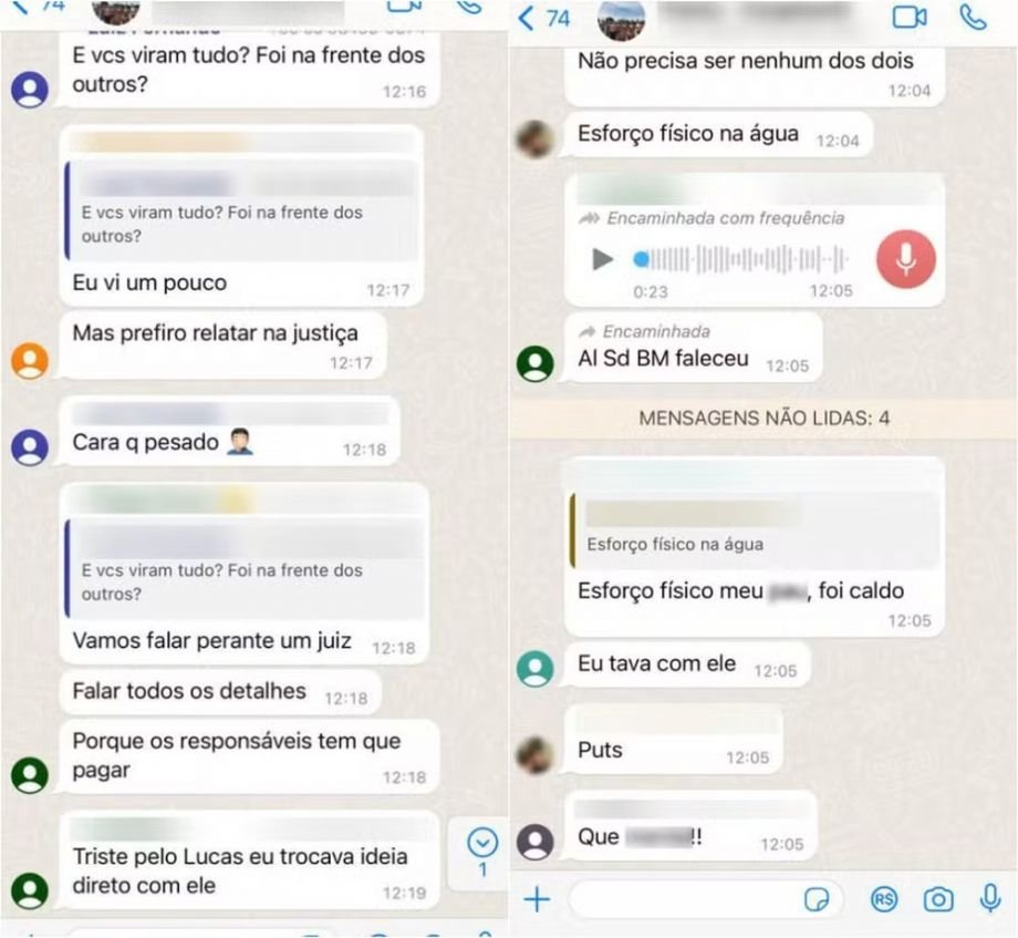 Prints de conversas em grupos de WhatsApp entre alunos do curso de salvamento do Corpo de Bombeiros sugerem que Lucas Veloso Peres, de 27 anos, levou um ‘caldo’ antes de morrer afogado durante um treinamento, na Lagoa Trevisan, em Cuiabá, nesta terça-feira (27).