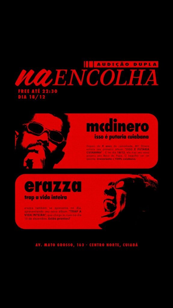 A cena da música urbana de Cuiabá terá um encontro inédito no próximo dia 18 de dezembro com o evento “Na Encolha – Audição Dupla Oficial”, que será realizado no Beco do Papá, na Avenida Mato Grosso. A festa marcará o lançamento simultâneo de dois álbuns: “Isso É P#taria Cuiabana!” de MC Dinero, referência do funk cuiabano, e “TRAP A VIDA INTEIRA” de erazza, artista que transita entre Cuiabá e São Paulo, conectando a cena urbana mato-grossense à capital paulista. O evento começa às 21h30 e segue até as 3h, combinando lançamento de disco, performances ao vivo e club culture, com entrada gratuita até as 22h30.