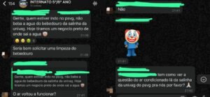 Em um print de troca de mensagens é possível ver os internos reclamando sobre as condições e alertando outros alunos a não consumirem a água do bebedouro, após encontrarem algo suspeito.