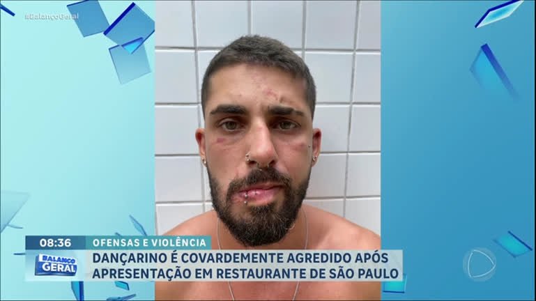 Um dançarino de 29 anos foi brutalmente agredido por seis homens após uma apresentação em um restaurante em São Vicente, no litoral paulista. A suspeita é que o ataque tenha acontecido por ciúmes, já que minutos antes, Flávio Arcangeletti teria dançado com uma mulher que estava com os agressores. A vítima ficou com ferimentos no rosto, cortou a boca e ficou com vários hematomas pelo corpo. O jovem está traumatizado e com medo de divulgar a agenda de shows.